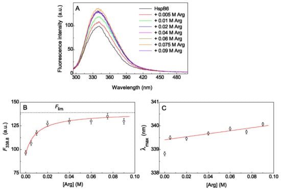 To interpret the obtained data correctly, it was necessary to analyze how Arg affects the molecular structure of protein chaperones. For this purpose, the intrinsic tryptophan fluorescence of HspB6 and 14-3-3ζm was investigated in the presence of various concentrations of Arg at an excitation wavelength of 292 nm and a fixed value of ionic strength (0.15 M). Figure 5A shows the tryptophan fluorescence spectra of HspB6 (0.32 mg/mL) at 25 °C in the presence of Arg. The fluorescence spectroscopy is very sensitive to the local environment of tryptophan residues, and any changes in this area lead to a change in the tryptophan fluorescence intensity and the position of the Trp emission maximum (λmax). In order to avoid errors in determining the values of λmax, the obtained spectra were fitted using the following Equation (3) [42,43]: