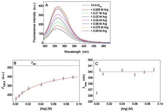 The effect of Arg on tryptophan fluorescence of 14-3-3ζm. (A) The tryptophan fluorescence spectra of 14-3-3ζm (0.48 mg/mL) in 0.03 M Hepes-buffer, containing 0.5 mM DTT, and in the presence of increasing concentrations of Arg from 0 to 0.09 M. The spectra were obtained at 25 °C, excitation wavelength of 292 nm and constant ionic strength of 0.15 M. (B) The dependence of fluorescence intensity on Arg concentration at λ = 336.5 nm. Points are the experimental data. The solid curve was calculated using Equation (4) at Kdiss = 0.049 M, F0 = 159 and Flim = 524. The horizontal dash line corresponds to Flim value. (C) The dependence of Trp emission maximum (λmax) on Arg concentration.