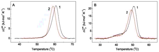 The structural changes in the protein molecule significantly affect the process of its thermal denaturation. Therefore, of special interest was to study the effect of Arg on the thermal unfolding of protein chaperones using the method of differential scanning calorimetry (DSC). Figure 7 shows the DSC profiles for HspB6 (1.2 mg/mL, Figure 7A) and 14-3-3ζm (1 mg/mL, Figure 7B) in the absence and presence of 0.1 M Arg at constant ionic strength of 0.15 M.