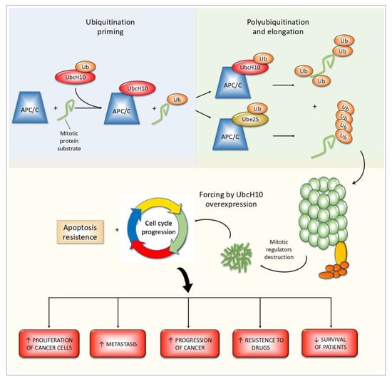 Ubiquitination-dependent proteolysis is related to various cellular processes including cell cycle progression, signal transduction, and differentiation. Ubiquitin (Ub) is a small regulatory protein of 76 amino acids that is attached to other proteins as a post-translational regulatory event. The ubiquitylation of proteins that must be removed is carried out by a sequential cascade that involves three classes of enzymes: the ubiquitin-activating enzymes (E1s) create a thioester bond between a cysteine residue into the active site and the carboxyl end of ubiquitin, and then transfer it to another cysteine on ubiquitin-conjugating enzymes (E2s). The E2 enzymes, in turn, transfer the ubiquitin units to specific protein substrates, autonomously or engaging specific ubiquitin ligases (E3s) enzymes that probably help E2s to ensure the specificity of the substrate [1,2,3]. In the human genome, two genes coding for E1s, at least 38 genes encoding for E2s and about six hundred genes coding for E3s have been identified [4]. Modified substrate proteins are recognized and subsequently degraded by the 26S proteasome, a multisubunit ATP-dependent protease complex, consisting of a cylindrical shaped 20S core, capped on one or both sides by a 19S regulatory particle [5,6]. The entire system is named ubiquitin proteasome system (UPS). Some components among these ubiquitin tagging enzymes arrays have become specialized to perform their function within the cell cycle regulation. The anaphase-promoting complex/cyclosome (APC/C) is a multisubunit complex being the main core an E3 ligase. By interacting with E2~Ub (intermediates, it catalyses polyubiquitination of key cell cycle regulators, inducing the metaphase/anaphase transition exit from mitosis, and maintenance of G1 [7]). It has been shown that in eukaryotes cells a specific ubiquitin-conjugating enzymes (E2) (UbcH10 in humans, coded by UBE2C gene) has a crucial role into the timer properties of APC/C. Moreover, in the early 2000s, it was observed that UbcH10 is highly expressed in numerous cancerous cell lines and various primary tumors in comparison with surrounding normal tissues [8]. Since then, many studies have examined the expression of UbcH10 in many human tumors, highlighting its contribution in the mechanisms of carcinogenesis and assuming its usefulness in a diagnostic and therapeutic context. The aim of this work is to evaluate the state of the art of the knowledge about the impact of UbcH10 (over-)expression in cancer, and speculate on new diagnostic and therapeutic possibilities.