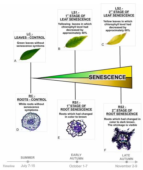 All experiments were performed on Populus trichocarpa (Torr. & A. Gray ex Hook.). Seeds were germinated on 1% agar. Seedlings (about 1–2 cm in length) were planted in soil in a seed-starting system. Plants were grown in a growth chamber (Conviron GR96) at 18 °C day/14 ℃ night temperature and a 16 h day/8 h night photoperiod. After two months, plants were transferred to rhizotrons as described in Wojciechowska et al. [95]. The material for the study was sampled during the first vegetative season at three time points based on morphological markers of senescence. For leaves, senescence-related stages were distinguished based on chlorophyll content. Chlorophyll measurements have been performed using a CCM-200 plus Chlorophyll Content Meter (Opti-Sciences, Hudson, NH, USA) in two places for one leaf (on both sides of each leaf blade analyzed). Such measurements were performed for 30 plants each time, throughout the vegetative season. The average result for green leaves (LC) was defined as 100% chlorophyll content. In yellowing leaves (LS1), material was collected in which the chlorophyll content dropped about 40%, and for yellow leaves (LS2) about 60% (Supplementary Figure S1B). For roots, senescence-related stages were also distinguished based on changing their color. Moreover, a viability test, as well as anatomical and cytological analyses, confirmed that color change was associated with the senescence process. The senescence-related stages have been broadly described in Wojciechowska et al. [13] and are presented in Figure 1.