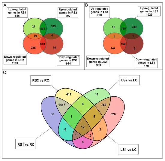 In roots, a total of 1898 differentially expressed genes (DEGs) were identified (One-way ANOVA corrected p-value cut-off = 0.001, post-hoc Tukey HSD and Benjamini–Hochberg correction, fold change ≥ 2) in the three stages of senescence that were analyzed. Most of the DEGs exhibited down-regulation in the early and late stages of senescence. A total of 924 DEGs were down-regulated in RS1 and 1169 in RS2. In contrast 556 DEGs were up-regulated in RS1 and 692 in RS2 (Figure 2A).