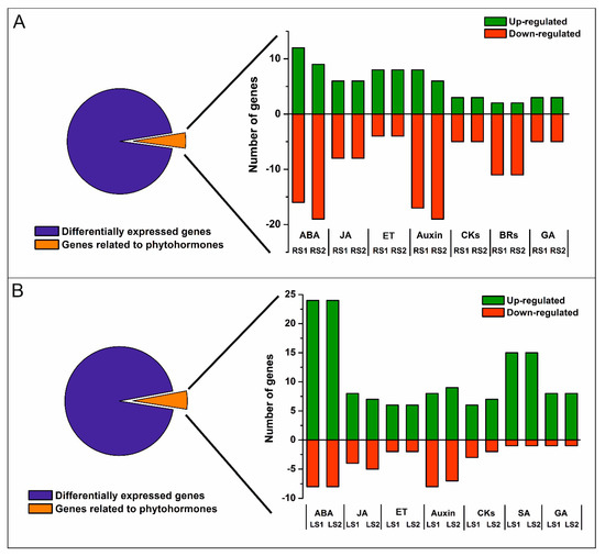 Number of up- and down-regulated phytohormone-related genes in roots (A) and leaves (B). Abbreviations: ABA, abscisic acid; JA, jasmonic acid; ET, ethylene; CKs, cytokinins; BRs, brassinosteroids; SA, salicylic acid; GA, gibberellic acid.