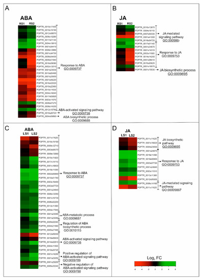 Genes associated with phytohormone pathways were identified among the DEGs of both organs using Gene Ontology (GO) within the Biological Process (BP) category. These included genes related to abscisic acid (ABA), jasmonic acid (JA), brassinosteroids (BRs), cytokinins (CKs), auxin (IAA), ethylene (ET), gibberellin (GA), and salicylic acid (SA) (Figure 4A–D, Supplementary Figures S4 and S5). Further analyses focused on genes related to ABA and JA in both organs since the microarray analysis indicated significant changes in the expression of ABA- and JA-related genes and because these two phytohormones are known as positive regulators of leaf senescence.