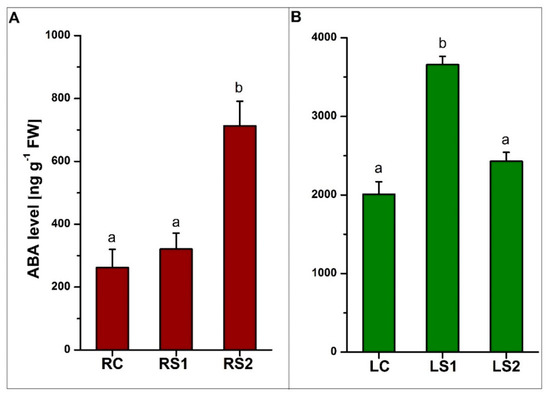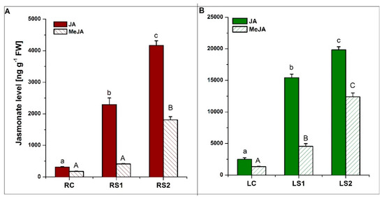 Quantitative analyses of jasmonates (JA and MeJA) were also conducted. The concentration of both JA and MeJA in both organs increased during senescence, with the highest levels observed in the second stage of senescence (LS2, RS2) (Figure 6A,B). All of the observed changes in jasmonate levels were statistically significant at a p-value < 0.05.