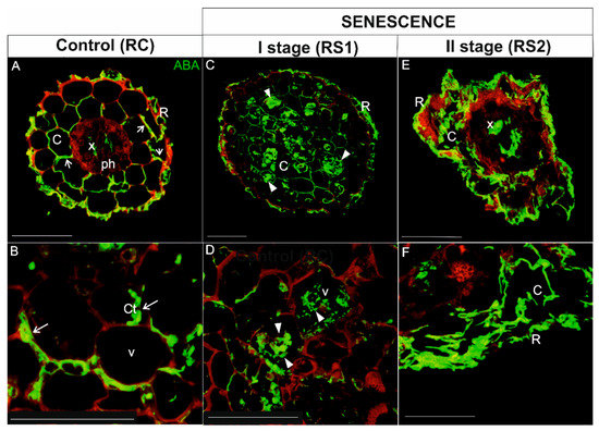 In roots, ABA was localized in the rhizodermis, cortical parenchyma cells, and vascular tissue (mainly in xylem) of control, viable roots (RC) (Figure 7A,B). A signal for ABA was detected in the peripheral cytoplasm of cortical parenchyma cells, which had a large central vacuole (Figure 7A,B; arrows). In the first stage of root senescence (RS1), the ABA signal was observed in the same tissues as in RC, but the cellular distribution was different in cortical parenchyma cells. In this case, the signal was not only concentrated in of the peripheral cytoplasm, but it was also evident in the vacuole (Figure 7C,D; arrowheads). The majority of cortical parenchyma cells were folded and irregular in shape in RS2, which made determining the precise distribution of ABA in these cells problematic. Nevertheless, an intense fluorescent signal was detected in the folded cortical parenchyma cells, as well as in xylem tracheary elements (Figure 7E,F).