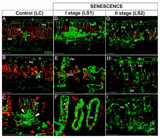 Immunodetection of ABA (green fluorescence) and red autofluorescence of chlorophyll during leaf senescence. (A–C) Leaves control (LC); (D–F) The first stage of leaf senescence (LS1); (G–I), The second stage of leaf senescence (LS2). Abbreviations: VB, vascular bundle; PM, palisade mesophyll; SM, spongy mesophyll; E – epidermis. Scale bars = 50 µm.