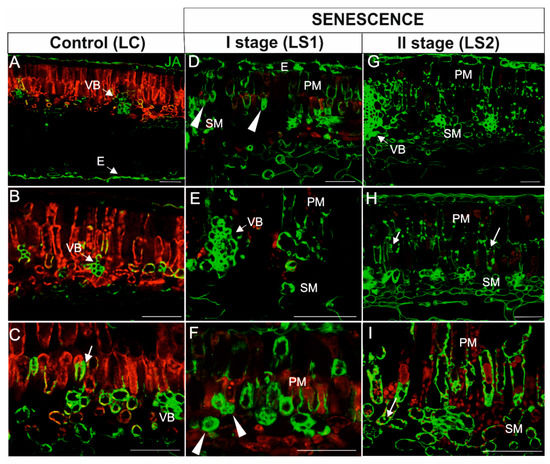 Immunodetection of JA (green fluorescence) and red autofluorescence of chloroplasts in leaves during senescence. (A–C) Leaves control (LC); (D–F) The first stage of leaf senescence (LS1); (G–I), The second stage of leaf senescence (LS2). Abbreviations: VB, vascular bundle; PM, palisade mesophyll; SM, spongy mesophyll; E, epidermis. Scale bars = 50 µm.