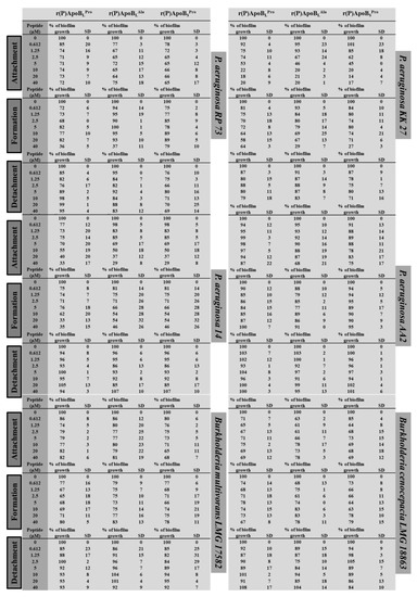 Anti-biofilm activity of r(P)ApoBLPro, r(P)ApoBLAla, and r(P)ApoBSPro peptides on P. aeruginosa RP 73, P. aeruginosa KK 27, P. aeruginosa 14, P. aeruginosa AA2, B. multivorans LMG 17582, and B. cenocepacia LMG 18863 in MHB medium.