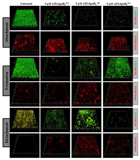 In order to further investigate anti-biofilm properties of ApoB-derived peptides, analyses were also performed by confocal laser scanning microscopy (CLSM). For this approach, we selected two bacterial strains not responsive to ApoB-derived peptides direct antimicrobial activity, such as B. cenocepacia LMG 18863 and P. aeruginosa 14. Peptide effects on biofilm attachment, formation and detachment were evaluated upon sample staining with LIVE/DEAD BacLight bacterial viability kit. Analyses revealed that all three peptides are able to affect biofilm attachment and formation in the case of B. cenocepacia LMG 18863 (Figure 2). Even more interestingly, peptides are able to affect pre-formed biofilm with the strongest effects observed in the presence of r(P)ApoBLAla (Figure 2). By staining bacterial biofilm with SYPRO® ruby dye, which is able to specifically stain biofilm extracellular matrix, the appearance of highly fluorescent aggregates is clearly evident upon treatment with peptides (Figure 2), thus indicating that peptides induce strong alterations of biofilm matrix architecture, as previously reported for different anti-biofilm agents [46]. Similar results were obtained also in the case of P. aeruginosa 14 (Figure 3). These findings are also supported by biofilm biovolume determinations by CLSM reported in Figure 4, that indicate a strong and significant effect of r(P)ApoBSPro peptide on biofilm eradication in the case of both bacterial strains (Figure 4c,f). Furthermore, peptides have been found to exert significant effects on biofilm biovolume when attachment is tested (Figure 4a,d), except for r(P)ApoBLAla for which no significant reduction in biovolume is observed, although a disaggregating effect is clearly evident (Figure 2 and Figure 3). This might be due to the fact that, upon treatment with r(P)ApoBLAla peptide, planktonic cells escape from biofilm by floating, with a consequent significant contribution to biovolume. Altogether, these findings confirm that peptides are able to exert significant anti-biofilm effects even on bacterial strains not sensitive to their direct antimicrobial activity.