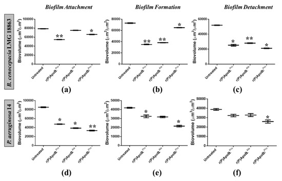 Analysis of the effects of r(P)ApoBLPro, r(P)ApoBLAla and r(P)ApoBSPro peptides on biofilm attachment (a,d), formation (b, e) and detachment (c,f) in the case of B. cenocepacia LMG 18863 (a–c) and P. aeruginosa 14 (d–f). Biovolume (µm3/µm2) was measured by using Zen Lite 2.3 software. Significant differences were indicated as * p < 0.05 or ** p < 0.01 for treated versus control samples.