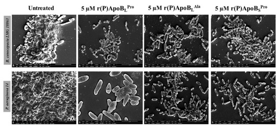 Morphological analyses of B. cenocepacia LMG 18863 (top panel) and P. aeruginosa 14 (lower panel) preformed biofilms by SEM. Representative images are shown upon treatment of bacterial biofilm with 5 μM r(P)ApoBLPro, r(P)ApoBLAla, and r(P)ApoBSPro. Bars 5 μm.