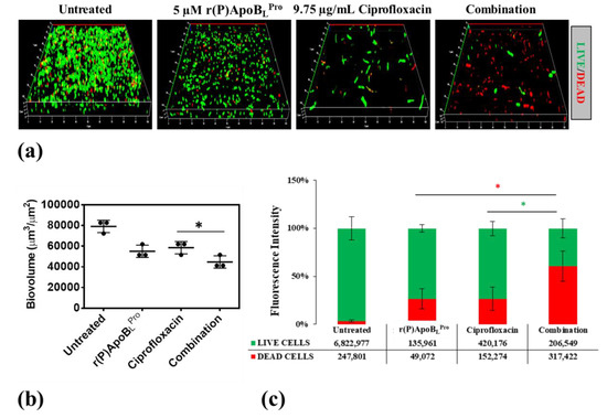 Effects of r(P)ApoBLPro, ciprofloxacin and a combination of the two compounds on preformed biofilm (a). Biofilm cells were stained by using LIVE/DEAD BacLight bacterial viability kit (Molecular Probes, Eugene, OR) containing 1:1 ratio of Syto-9 (green fluorescence, all cells) and propidium iodide (PI, red fluorescence, dead cells). Images are 3D projections of biofilm structure obtained by laser scanning confocal z-stack using Zen Lite 2.3 software. All images were taken under identical conditions. Biovolume (µm3/µm2) was measured by using Zen Lite 2.3 software. Significant differences were indicated as * p < 0.05 for treated versus control samples (b). Numbers of live and dead cells were evaluated by using Zen Lite 2.3 software (c).