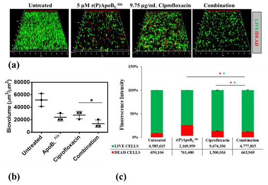 Effects of r(P)ApoBLAla, ciprofloxacin and a combination of the two compounds on preformed biofilm (a). Biofilm cells were stained by using LIVE/DEAD BacLight bacterial viability kit (Molecular Probes, Eugene, OR) containing 1:1 ratio of Syto-9 (green fluorescence, all cells) and propidium iodide (PI, red fluorescence, dead cells). Images are 3D projections of biofilm structure obtained by laser scanning confocal z-stack using Zen Lite 2.3 software. All images were taken under identical conditions. Biovolume (µm3/µm2) was measured by using Zen Lite 2.3 software. Significant differences were indicated as * p < 0.05 for treated versus control samples (b). Numbers of live and dead cells were evaluated by using Zen Lite 2.3 software (c).