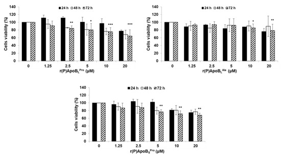 Effects of r(P)ApoBLPro, r(P)ApoBLAla and r(P)ApoBSPro peptides on the viability of BEAS cells. Cell viability was assessed by MTT assays, and expressed as the percentage of viable cells with respect to controls (untreated cells). Error bars indicate standard deviations obtained from at least three independent experiments, each one carried out with triplicate determinations. Significant differences were indicated as * p < 0.05, ** p < 0.01 or *** p < 0.001 for treated versus control samples.