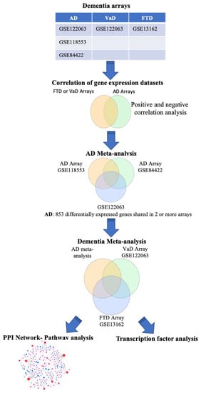 Flowchart of the study. Microarray data from postmortem brain tissue of Alzheimer’s disease (AD), vascular dementia (VaD), and frontotemporal dementia (FTD), patients was curated and differential gene expression analyzed using the BaseSpace Correlation Engine (BSCE). Meta-analysis of 3 independent AD studies was performed using BSCE. The list of genes identified in the AD meta-analysis was compared to the differentially expressed genes in VaD and FTD using a Venn diagram analysis. Protein–protein interactions and transcription factors (TF) network analysis identified dysregulated pathways and TF shared and unique to each dementia.