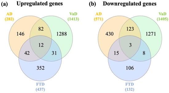 Venn diagram analysis of differentially expressed genes. (a) Venn diagram analysis of upregulated genes in AD, VaD, and FTD. (b) Venn diagram analysis of downregulated genes in AD, VaD, and FTD. The genes in the AD group represent the genes identified in the meta-analysis of AD datasets.