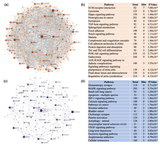 Network analysis of upregulated genes identified in the meta-analysis of AD datasets resulted in a unique network centered on signal transducer and activator of transcription 3 (STAT3) and elongation factor 1 alpha (EEF1A). This network was predominantly enriched in genes associated with adherens and tight junctions, mitogen-activated protein kinase (MAPK), and phosphatidylinositol 3-kinase and protein kinase B/Akt (PI3K-AKT) signaling pathways (Figure 3a,b). Analysis of downregulated genes identified in the meta-analysis of AD datasets resulted in a unique network centered on calmodulin 3 (CALM3). Downregulated genes were predominantly enriched in the calcium signaling pathway (Figure 3c,d).