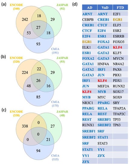 Transcription factors analysis. The AD, VaD, and FTD genes lists were uploaded to NetworkAnalyst, https://www.networkanalyst.ca/NetworkAnalyst/faces/home.xhtml. The gene-transcription factor interaction network was performed using ENCODE, ChEA, and JASPAR databases and (a), (b), and (c) represent the results of the Venn diagram analysis performed with AD, VaD and FTD genes, respectively. The transcription factors interacting with the AD, VaD, and FTD genes were listed in (d). The transcription factor in red is shared between the 3 types of dementia. The transcription factors in blue are shared between AD and VaD. The transcription factor in brown is shared between AD and FTD. The transcription factors in black are unique to each dementia analysis.