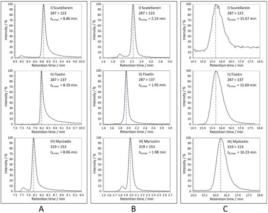 Representative multiple reaction monitoring (MRM) transitions and retention times as represented by scutellarein, fisetin, and myricetin, analyzed using HPLC-MS/MS on the: (A) K-C18, (B) K-F5, and (C) IAM.PC.DD2 chromatographic column.