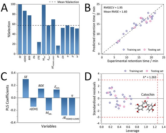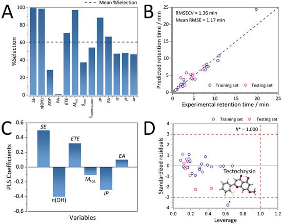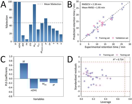 Performance characteristics of the consensus genetic algorithm-partial least squares (GA-PLS) quantitative structure retention relationships (QSRR) model for the C18 column. (A) Occurrence (expressed through % of selection) of molecular descriptor selection in 1000 GA-PLS runs. (B) Predictive ability on the training and validation sets (n = 30). (C) Distribution of the PLS coefficients (intercept = 0, due to autoscaling). (D) Applicability domain computed on the training and testing sets. Warning limits: three multiples of the standard deviation of standardized residuals, and critical leverage (h*) of 0.714 (n = 30). Royal blue circles depict the training set observations, whereas the pink diamonds depict the testing set observations.