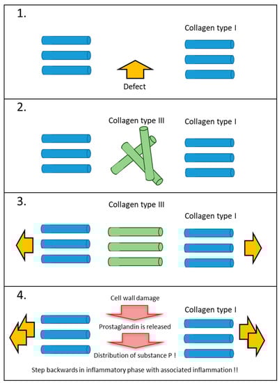 Collagen type I is mechanically very robust. Much greater (and longer-lasting) functional stimulation is required to effect adaptation. The turn-over time is 150 to 500 days, depending on the type of tissue. If no functional stimulation is provided during the proliferation phase, the definitive collagen type I—as described—will also form into a collagen ball. It will now require much longer-lasting and mechanically stronger stimulation before it is functionally aligned [,,]. However, such remodelling is always accompanied by temporary tissue weakening. This must always be taken into account—especially in patients who are undergoing stress. Overdosage inevitably results in a new inflammatory phase, which must be avoided at all costs.