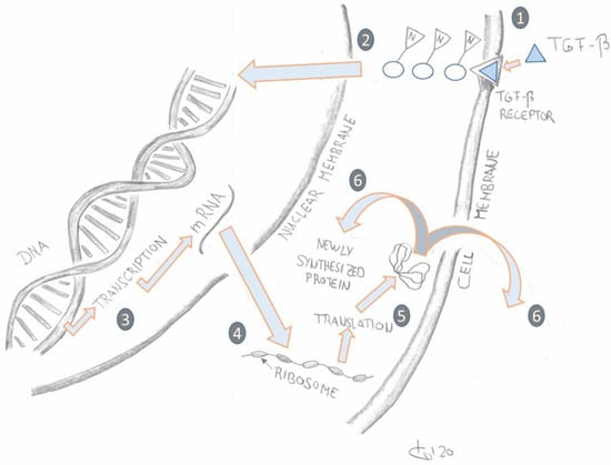 Schematic simplified representation of Transforming Growth Factor Beta (TGF-β) signal transduction outside and inside the cell [,]. (Graphic: T. Koller.) Legend: (1). TGF-β attaches to the TGF-β receptor on the cell membrane. (2&3). Signalling transcription factors transduce the extracellular TGF-β signalling from the cell-bound TGF-β receptors into the nucleus where they activate or inhibit transcription of TGF-β target genes into the respective mRNA sequences. (4&5). In the cytoplasm the mRNA sequences are translated by ribosomes into proteins. (6). The newly synthesized proteins are either exported out of the cell to form collagen or they are used for intracellular processes.