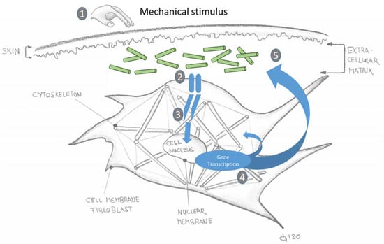 Figure 4 shows the mechanotransduction process schematically. The mechano-sensors are stimulated by a mechanical stimulus from outside (here using the example of a fibroblast). These in turn activate “adapter proteins”, which are located on the cell nucleus membrane (nuclear membrane). These “adapter proteins” transmit the mechanical stimulus to the cytoskeleton. In this way they stimulate the skeletal structure. The cell reacts with gene transcription and passes on correspondingly altered (adapted) processes and products to the extracellular matrix. Thus, a cell response to a mechanical stimulus from outside takes place [,].