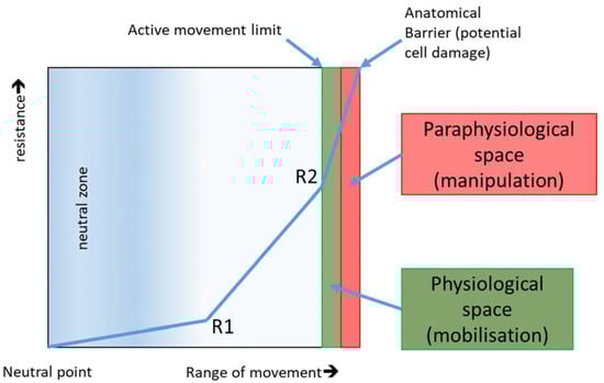 Behaviour of resistance depending on the extent of movement in joints and connective tissue. R1 represents the first and R2 represents the second remarkable increase in connective tissue resistance. Depending on the intensity of the manual degree classification (dosage), therapists treat passively more or less into physiological space. The paraphysiological space is only achieved by impulse mobilisation. If the anatomical barrier is crossed, cell damage occurs (lesion) and reacts with an inflammatory reaction. This anatomical barrier is important in post-traumatic and postoperative conditions due to adhesions and water soluble crosslinks to the front postponed. Especially in the proliferation phase, it can quickly lead to an overdose. The microtraumatic injuries trigger new inflammatory phases, which result in increased restriction of movement and restriction [] (source: own illustration).