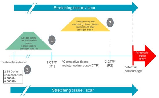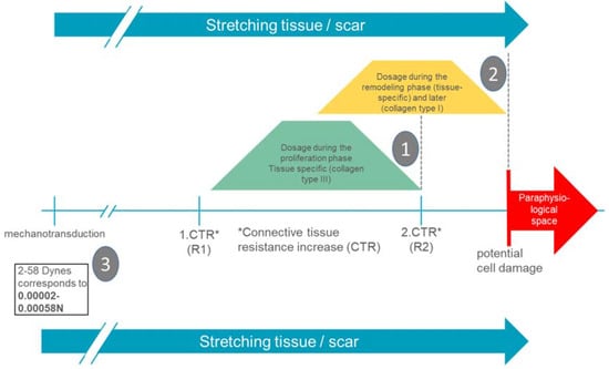 Since mechanotransductive cell responses are already initiated by minimal forces (up to 0.00058 N), functional alignment is already achieved with very gentle manual therapeutic interventions []. The empirically known remarkable increases in connective tissue resistance (R1 and R2) in the back area are 1–2 N for R1 and 2–4 N for R2 [,]. It can therefore be assumed that manual interventions in the area of R1 probably already provide an adequate stimulus for the scar tissue to produce a mechanotransductive response of the cell and thus a functional alignment of the extracellular matrix.