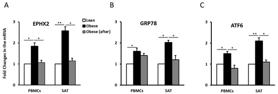EPHX2 and GRP78 expression in PBMCs was similar to that of SAT, with elevated levels in obese subjects that decreased after exercise (p < 0.05) (Figure 2C); despite some variation between the subjects was observed (Figure S2). ATF6 levels were not quantified due to the unsatisfactory quality of the Western Blot obtained (data not shown).