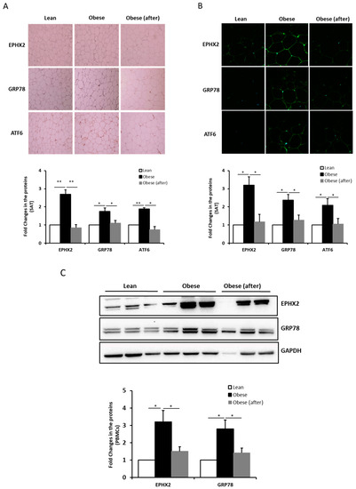 EPHX2 protein levels in SAT and PBMCs from human subjects. Representative immunohistochemical (A) and confocal immunofluorescence (B) images illustrating EPHX2, GRP78, and ATF6 expression and localization in SAT from lean, obese before exercise, and obese after exercise group (n = 5 each). Staining quantification of SAT was performed as detailed in Materials and Methods; data are presented as fold changes compared to the normal-weight group. (C) Protein expression of EPHX2, GRP78, and ATF6 in PBMCs according to groups (at least n = 9 each). Protein levels were measured by Western Blotting. GAPDH was used as an internal control for normalization. Data are presented as fold changes compared to the lean participants. * p < 0.05; ** p < 0.01.