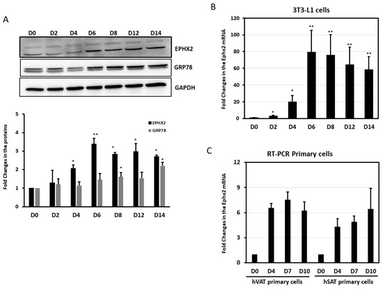Expression levels of EPHX2 during differentiation of preadipocytes. Protein (A) and mRNA (B) levels were measured by Western Blot and quantitative real-time PCR, respectively, in 3T3-L1 preadipocytes (D0) and adipocytes differentiated for 14 days (D2–D14) from three independent experiments. (C) mRNA levels were measured by quantitative real-time PCR in human visceral (hVAT), subcutaneous (hSAT) preadipocytes (D0), and adipocytes differentiated for 10 days (D4–D10) from two independent experiments. Data are presented as the fold change in differentiated adipocytes compared with preadipocytes (D0). * p < 0.05; ** p < 0.01.