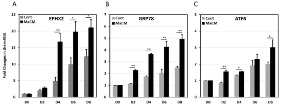 Expression levels of EPHX2 during the differentiation of 3T3-L1 preadipocytes and their treatment with a macrophage culture medium. mRNA expression levels of EPHX2 (A), GRP78 (B), and ATF6 (C) were measured by quantitative real-time PCR in 3T3-L1 preadipocytes (D0) and adipocytes differentiated for 8 days (D8) with and without macrophage-conditioned medium (MaCM). Data are presented as fold changes in differentiated adipocytes compared with preadipocytes from three independent experiments. * p < 0.05; ** p < 0.01.