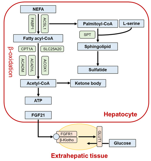 PPARα also reflated the gene encoding fibroblast growth factor 21 (FGF21), a hepatokine secreted from the liver into blood, binding to a plasma membrane receptor complex on target tissues, mainly the FGF receptor 1 and β-Klotho heterodimer, and enhancing expression of glucose transporter 1 in extrahepatic tissues, leading to improved systemic insulin sensitivity and lipid turnover [22,23]. Hepatic and serum levels of FGF21 were significantly increased by PPARα activation, whereas the constitutive levels were markedly lower in Ppara-null mice compared with wild-type mice [24]. These findings suggest that PPARα’s control of hepatic metabolism is partially mediated by FGF21.