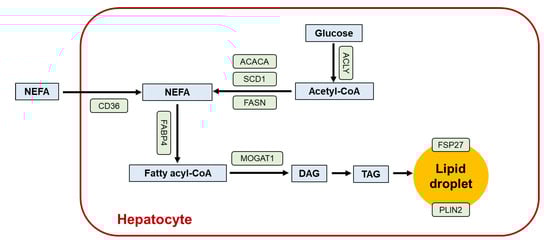 The contribution of PPARγ to hepatic lipid metabolism is summarized in Figure 3. When PPARγ is ectopically overexpressed in hepatocytes, lipid droplets emerge. Adenovirus-mediated overexpression of PPARγ2 in hepatocytes increased hepatosteatosis and hepatocyte-specific disruption of PPARγ gene (Pparg) decreased liver steatosis in ob/ob mice [13,73]. The notion that hepatic PPARγ expression promotes steatosis is supported by the facts that PPARγ up-regulates several proteins associated with lipid uptake, TAG storage, and formation of lipid droplets, such as FABP4, fat-specific protein 27 (FSP27)/Cidec, CD36, monacylglycerol O-acyltransferase 1, and perilipin 2 [74]. When the expression of adipogenic transcriptional factor genes Pparg and Srebp1c were observed during HFD feeding, Pparg2 mRNA levels rose before Srebp1c mRNA at 4 weeks [75], which were closely associated with adipogenesis-related protein, CD36, and fatty acid synthase [76,77]. A significant increase in hepatic PPARγ is one of the common phenotypes of steatotic animals associated with obesity [13] and without obesity, which lack TAG-storing capacity in adipocytes [78,79]. Similar overexpression of hepatic PPARγ was observed in NAFLD/NASH patients after pancreaticoduodenectomy, who were generally non-obese [80,81].