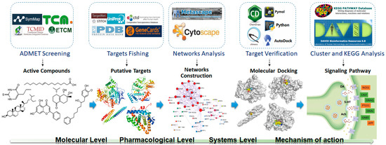 - Ru, J.; Li, P.; Wang, J.; Zhou, W.; Li, B.; Huang, C.; Li, P.; Guo, Z.; Tao, W.; Yang, Y.; et al. TCMSP: A database of systems pharmacology for drug discovery from herbal medicines. J. Cheminformatics 2014, 6, 13. [Google Scholar] [CrossRef]