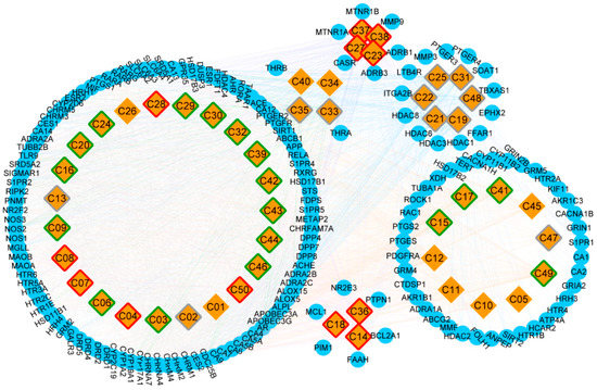 The construction of Compound-Target network, and the classification of putative target proteins of A. oxyphylla. The candidate compounds (diamond mesh node with yellow) are divided into groups by structural category, the pharmacokinetic properties of which are divided into good (red border), moderate (green border), week (gray border), and N/A (white border). Similarly, the putative target proteins (the circular mesh node with blue) are grouped and surrounded with the corresponding compounds.