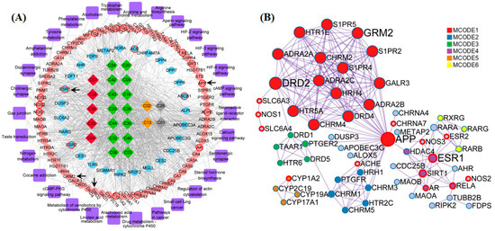 The constructions and analysis of compound-target-pathway (CTP) network and the Protein-Protein Interaction (PPI) network of terpenes. (A) The candidate compounds with different pathological properties (good: Red diamond, moderate: Green diamond, week: Yellow diamond and N/A: Gray diamond), the ellipse nodes respect the KEGG enrichment terms with p < 0.01 (pink ellipse) and nodes not enriched in KEGG with p < 0.01 (blue ellipse), and AD-associated proteins (ellipse with red border) and the pathways (purple round rectangle) of Terpenes are constructed. (B) The protein-protein-interaction (PPI) network of Terpenes are illustrated with color by clusters and size by degree. Among these nodes, APP, ESR1, DRD2 and GRM2 are served as core targets with red border.