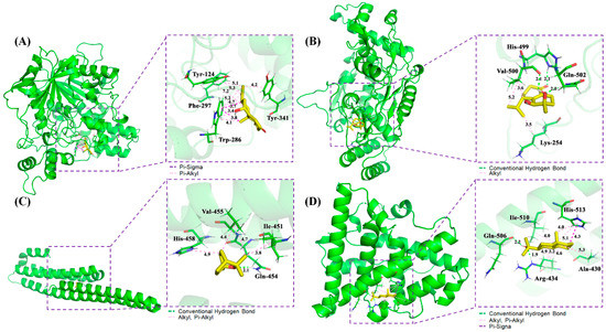 The binding ability, sites, and interactions between compound and target proteins were achieved and analyzed by classical molecular dynamics using AutoDockTools-1.5.6, Pymol 2.3 and Discovery Studio 4.5 Client [77,78]. The 3D chemical structural formulas of candidate compounds were obtained from PubChem and energy minimizing employed to ChemBioDraw 3D. In addition, the crystal structures of putative targets were obtained from the Protein Data Bank (http: //www.pdb.org/) and decorated by removing the ligands and water motifs, revising it and optimizing the mutation sites, and adding hydrogen through the Pymol 2.3 and UCSF Chimera 1.14rc software.