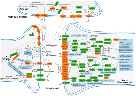 The left panel of Figure 6 shows that SLC18A1, 2, and 3 may have a role in synaptic vesicle cycling, acetylcholinesterase (ACHE) [42], and amine oxidase [flavin-containing] A (MAOA) [43,44] signaling, which have been shown to be involved in tryptophan metabolism, clycerophospholipid metabolism, and also related to cocaine and amphetamine addiction, as well as alcoholism, and Parkinson’s disease in the presynaptic nerve terminal. Neurotransmitters, such as dopamine (DA, hsa04728), serotonin (5-HT, hsa04726), and acetylcholine (ACh, has04725) work on muscarinic acetylcholine receptor M2 (CHRM2) [45] and MAOA for DA metabolism in glial cells, as well as on CHRNA7 [46] and CHRM1 [47] for calcium (Ca2+) storage by Ca2+-induced Ca2+ release (CICR) [48], and on HTR2A-SLC6A4-IP3-TRPC1 [49,50] pathway for Ca2+ transport, respectively. On the postsynaptic cell membrane, DA, is the prototypical slow neurotransmitter of the mammalian brain, which interacts with D1-like receptors DRD1 and DRD5 [51,52], both positively coupled to adenylyl cyclase (AC) and cAMP production, which are activated and regulated downstream of PTGS1 and NOS1 expression. While the activation of D2-like receptors DRD2, DRD3, and DRD4 have exactly the reverse effect on regulating the production of AC and cAMP in dopaminergic synapse pathway (hsa04728) [51] activity. More evidence has suggested that DA influences neuronal activity, synaptic plasticity, and behavior by diverse cAMP- and Ca2+-dependent and independent mechanisms (has 04020). Similarly, ACh binds and activates muscarinic acetylcholine receptors CHRM1, 2, 3, 4, and 5 [53], and directly alters cellular homeostasis of phospholipase C, inositol trisphosphate, cAMP, free Ca2+, and the activation of neuronal ACh receptors CHRNA4 and 7 [54]. It also regulates the rapid influx of sodium (Na+) and Ca2+, leading to the subsequent cellular depolarization by cAMP (hsa04024), MAPK (hsa04010), and phosphoinositide 3-kinase (PI3K)/AKT (hsa04151) signaling pathways. For monoamine neurotransmitters, serotonin (5-hydroxytryptamine, 5-HT) binds to ionotropic 5-HT3 receptors, GPCR 5-HT receptors, 5-HT1 (Gi/Go -coupled), 5-HT2 (Gq-coupled), 5-HT4/6/7 (Gs-coupled), and 5-HT5 receptors, which can be directly or indirectly involved in the regulation of synaptic transmission, neuronal excitability, synaptic plasticity, and neuroprotection [55,56]. Therefore, we hypothesize that A. oxyphylla or terpenoids are natural compounds that may play an important role in mediating anti-AD effects by functional annotation and enrichment analysis of neurotransmitter receptors.