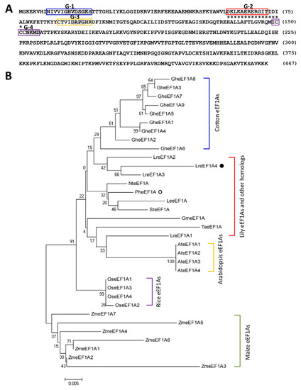 Amino acid and phylogenetic analysis of LreEF1A4. (A) Deduced amino acid sequence of LreEF1A4 from Lilium regale. The central regions (G-1 to G-4) involved in guanosine 5′-diphosphate/ guanosine 5′-triphosphate (GDP/GTP) exchange and GTP hydrolysis are boxed in blue, red, orange, and purple, respectively. The conserved three elements GXXXXGK (G14–K20), DXPG (D91–G94), and NKXD (N153–D156) in the GTP-binding domain are shaded in grey. Asterisks indicate the GTP-binding elongation factor signature. (B) Phylogenetic tree of LreEF1A4 with three other L. regale LreEF1As, Petunia hybrida PheEF1A (Peaxi162Scf00351g00321, Sol Genomics Network database), Lycopersicum esculentum LeeEF1A (P17786), Solanum tuberosum SteEF1A (XP_006340223), Nicotiana tabacum NteEF1A (XP_016492900), Glycine max GmeEF1A (P25698), Triticum aestivum TaeEF1A (AQU14666), Arabidopsis AteEF1A1 (At1g07920), AteEF1A2 (At1g07930), AteEF1A3 (At1g07940), and AteEF1A4 (At5g60390), Oryza sativa OseEF1A1 (BAA23657), OseEF1A2 (BAA23658), OseEF1A3 (BAA23659), and OseEF1A4 (BAA23660), Gossypium hirsutum GheEF1A1 (ABA12217), GheEF1A2 (ABA12218), GheEF1A3 (ABA12219), GheEF1A4 (ABA12220), GheEF1A5 (ABA12221), GheEF1A6 (ABA12222), GheEF1A7 (ABA12223), GheEF1A8 (ABA12224), and GheEF1A9 (ABA12225), and Zea mays ZmeEF1A1 (AAF42976), ZmeEF1A2 (AAF42977), ZmeEF1A3 (AAF42978), ZmeEF1A4 (AAF42979), ZmeEF1A5 (AAF42980), ZmeEF1A6 (AAF42981), and ZmeEF1A7 (AAF42982). LreEF1A4 and PheEF1A are highlighted by solid and hollow circles. Boot-strap values were determined as a percentage of 1000 replicates and shown at corresponding branch nodes. Scale bar denotes the number of amino acid substitutions per site.