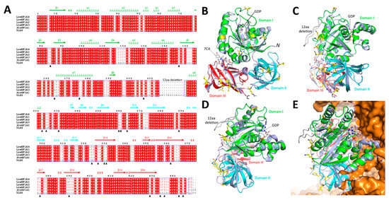 Sequence alignment of the four LreEF1A copies (LreEF1A1–4) in lily identified a total of 24 amino acid sites displaying residue substitutions (Figure 2A). To investigate whether the amino acid substitutions affect the enzymatic functions of different LreEF1A homologs, a high-quality structural model of LreEF1A4 was built using the mammalian elongation factor structure (Protein Data Bank: 5LZS) as the template. The 5LZS structure, consisting of three major domains (Figure 2B–D), was chosen as the template due to it being in complex with the enzyme substrate GDP and the other interacting components in the ribosomal machinery. The spatial locations of these substitution sites were examined in this generated LreEF1A4 model. As shown in Figure 2A,B, most of these amino acid substitutions (16/24) were found located in the loop regions. No amino acid substitution site in the substrate-binding (GDP) domain I displayed any interacting potential with the superimposed substrate (Figure 2C). All of the identified amino acid changes were located on a single side of the protein model (Figure 2D), facing away from the ribosomal interacting side (Figure 2E). These results indicate that the amino acid changes may not affect the interaction of different LreEF1As with the other components in the ribosomal complex.