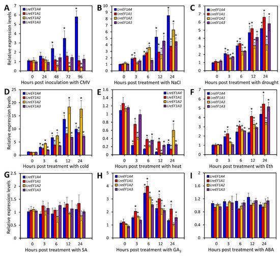 To compare the expression pattern difference of LreEF1A4 with three other copies, the healthy leaves of L. regale at the two-leaf stage were inoculated with CMV and treated with various abiotic stressors and plant growth regulators. LreEF1A4 was rapidly and dramatically up-regulated upon CMV infection, whereas a significant down-regulation of LreEF1A2 transcripts was observed. In contrast, expression levels of LreEF1A1 and LreEF1A3 remained stable during the entire infection period (Figure 3A). Transcript abundances of all four LreEF1A genes increased following treatments with high salinity, dehydration, and low temperature, with LreEF1A4, LreEF1A1, and LreEF1A2 reaching relatively higher levels at 12 or 24 h post treatment (HPT), respectively (Figure 3B–D). A remarkable decrease in the expression of four LreEF1As occurred under heat stress (Figure 3E). For treatments with stress-associated hormones, LreEF1A1–4 were all activated following exposure to ethylene (Eth) and this activation was maintained thereafter until 24 HPT (Figure 3F). Transcripts of LreEF1A1–4 were also induced by gibberellic acid (GA3) treatment, with a peak at 6 HPT and a subsequent decline (Figure 3H). No significant alteration of transcription was found for LreEF1As in response to salicylic acid (SA) and abscisic acid (ABA) (Figure 3G,I).