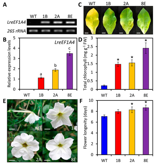 2.4. Ectopic Overexpression of LreEF1A4 Delays Leaf and Flower Senescence