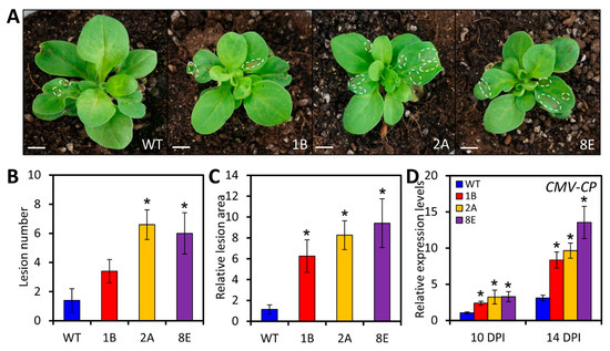 Given the pronounced up-regulation of LreEF1A4 in L. regale plants upon CMV infection, the role of LreEF1A4 in defense response against CMV was then examined. CMV strain was used to inoculate WT and transgenic petunia plants with LreEF1A4 overexpression. At 14 days post inoculation (DPI), the overexpression lines exhibited more distortion of uppermost systemically-infected leaves and stunting of affected plants than WT lines (Figure 5A). An increased number and larger size of necrotic lesions were found in the infected leaves of transgenic plants (Figure 5B,C). This symptom variation was in accordance with the measured accumulation of CMV coat protein (CMV-CP) transcripts, which were significantly increased in LreEF1A4-overexpressing lines at 10 and 14 DPI, compared to WT control (Figure 5D).