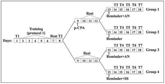 Scheme of the experimental series 1 (protocol 1) and series 2 (protocol 2; Groups 1/5, 2/6, 3/7 and 4/8). In the boxes indicated the days of the experiment. 1 day (T1)—initial testing of the level of defensive reactions, 2–6 days (Training)—development of a conditioned reflex in the context paradigm, Day 7 (Rest)—rest, Day 8 (T2)—testing of the level of defensive reaction after the procedure of training. Groups 1/5 and 2/6 “p-CPA + reminder + AN” and “p-CPA + reminder”: Day 9—injection of p-CPA, 10–12 days (Rest)—rest, 13 day Group 1/5: (Reminder + AN)—reminder session and subsequent injection of anisomycin (AN), Group 2/6: (Reminder)—reminder session, 14–18 days (T3, T4, T5, T6, T7)—testing of the level of defensive reaction after reminder session. Groups 3/7 and 4/8 “reminder + AN” and “reminder + SS”: 9–12 days (Rest)—rest, 13 day Group 3: (Reminder + AN)—reminder session and subsequent injection of anisomycin (AN), Group 4: (Reminder)—reminder session and subsequent injection of saline solution (SS), 14–18 days (T3, T4, T5, T6 and T7)—testing of the level of the defensive reaction after a reminder session.