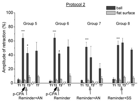 The level of the defensive response (the amplitude of response of ommatophores withdrawal) of snails in two contexts, on the ball and flat surface for the experimental series 2 (protocol 2; Groups 5, 6, 7 and 8). T1—initial testing before the beginning of training, T2—testing 2 days (after 1 day of rest) after elaboration of conditioned reflex (learning), T3–T7—testing of animals after the injections of PCPA, AN and a reminder on the 4th–8th day after a reminder (see Figure 1). Arrows indicate: PCPA—time of injection of PCPA (3 days before the reminder and injection of AN), Reminder—time of reminder, AN—time of injection of AN. Asterisks and hash signs indicate significant difference of the amplitude of response of ommatophores withdrawal in responses to T3–T7 vs. the amplitude of the response of ommatophores withdrawal in responses to T2 by a paired t-test (#) equal to p < 0.05 and T2 vs. amplitude of response of ommatophores withdrawal in responses to T1 by a paired t-test (***) equal to p < 0.001. The vertical axis shows the value of the defensive reaction in response to the conditioned stimulus (the amplitude of reaction of ommatophores withdrawal), in % to maximum. Horizontal axis shows the course (protocol) of the experiment: T1, T2, T3-T7, PCPA, AN and Reminder.