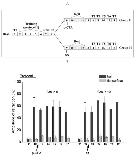 A. Scheme of the experimental series 3 (protocol 1; Groups 9 and 10). In the boxes indicated the days of the experiment. 1 day (T1)—initial testing of the level of defensive reactions, 2–6 days (Training)—development of the conditioned reflex in the context paradigm, Day 7 (Rest)—rest, Day 8 (T2)—testing of the level of the defensive reaction after the procedure of training. Group 9 “PCPA” and group 10 “SS”: Day 9—injection of PCPA/SS, 10–12 days (Rest)—rest, 13 day (Rest)—rest, 14–18 days (T3, T4, T5, T6 and T7)—testing of the level of the defensive reaction after the reminder session. B. The level of the defensive response (the amplitude of the response of ommatophores withdrawal) of snails in two contexts, on the ball and flat surface for the experimental series 1 (protocol 1; Groups 9 and 10). T1—initial testing before the beginning of training, T2—testing 2 days after elaboration of the conditioned reflex (learning), T3–T7—testing of animals after the injections of PCPA and SS on the 4th–8th day after reminder (see Figure 4A). Arrows indicate: PCPA—time of injection of PCPA, SS—time of injection of SS. Asterisks indicate significant difference of the amplitude of response of ommatophores withdrawal in responses to T2 vs. the amplitude of the response of ommatophores withdrawal in responses to T1 by a paired t-test (**) equal to p < 0.01. Vertical axis shows value of defensive reaction in response to conditioned stimulus (the amplitude of the reaction of ommatophores withdrawal), in % to maximum. Horizontal axis shows the course (protocol) of the experiment: T1, T2, T3–T7, PCPA, AN and Reminder.