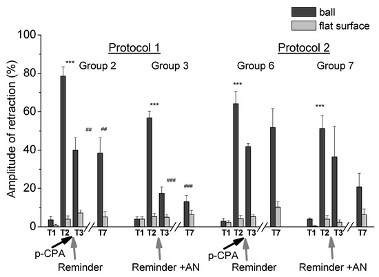 The level of the defensive response (the amplitude of the response of ommatophores withdrawal) of snails in two contexts, on the ball and flat surface for the experimental series 1 (protocol 1; Groups 2 and 3) and experimental series 2 (protocol 2; Groups 6 and 7). T1—initial testing before the beginning of training, T2—testing 2 days after elaboration of the conditioned reflex (learning), T3–T7—testing of animals after the injections of PCPA, AN and a reminder on the 4th–8th day after a reminder. Arrows indicate: PCPA—time of injection of PCPA (3 days before a reminder and injection of AN), Reminder—time of reminder, AN—time of injection of AN. Asterisks and hash signs indicate a significant difference of the amplitude of the response of ommatophores withdrawal in responses to T3–T7 vs. the amplitude of the response of ommatophores withdrawal in responses to T2 by a paired t-test (##) equal to p < 0.01; (###) equal to p < 0.001 and T2 vs. the amplitude of the response of ommatophores withdrawal in responses to T1 by a paired t-test (***) equal to p < 0.001. The vertical axis shows the value of the defensive reaction in response to a conditioned stimulus (the amplitude of the reaction of ommatophores withdrawal), in % to maximum. Horizontal axis shows the course (protocol) of the experiment: T1, T2, T3–T7, PCPA, AN and Reminder.